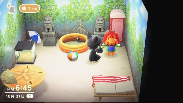 On the other hand, the Japanese-language version all but spells it out for you starting with his name アーサー aasaa (a play on shiisaa although it’s translated as Arthur), his catchphrase is ナハッ (Naha! and in English it’s capital — as in Naha is the capital of Okinawa), his quote is なんくるないさ (nankurunaisa and in English it’s set ’em up and knock ’em down), and his favorite song (the one playing from his house radio) is ハイサイけけ (haisai keke and in English it’s called K.K. Faire) — more on this below.