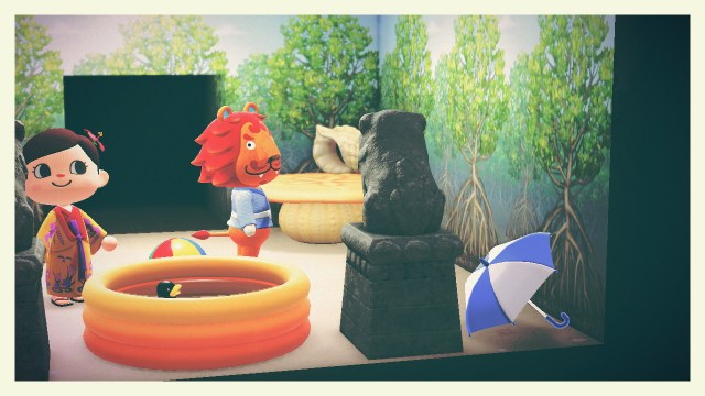 Rory (アーサー [aasaa] in the Japanese-language version) is a lion jock villager in the Animal Crossing video game fr0m Nintendo (above photos are from the New Horizons version of the game — he first appeared in the New Leaf version of the game) who is Ryukyuan. Playing the English-language version of the game doesn’t give you much aside from what can be seen visually (e.g. Rory looks like a shīsā and his home looks like it could be in Okinawa with the red-tile roof, mangrove wallpaper, shīsā, and tropical setting) and perhaps you may catch what sounds like kāchāshī playing from his house radio — more on this in a second.
