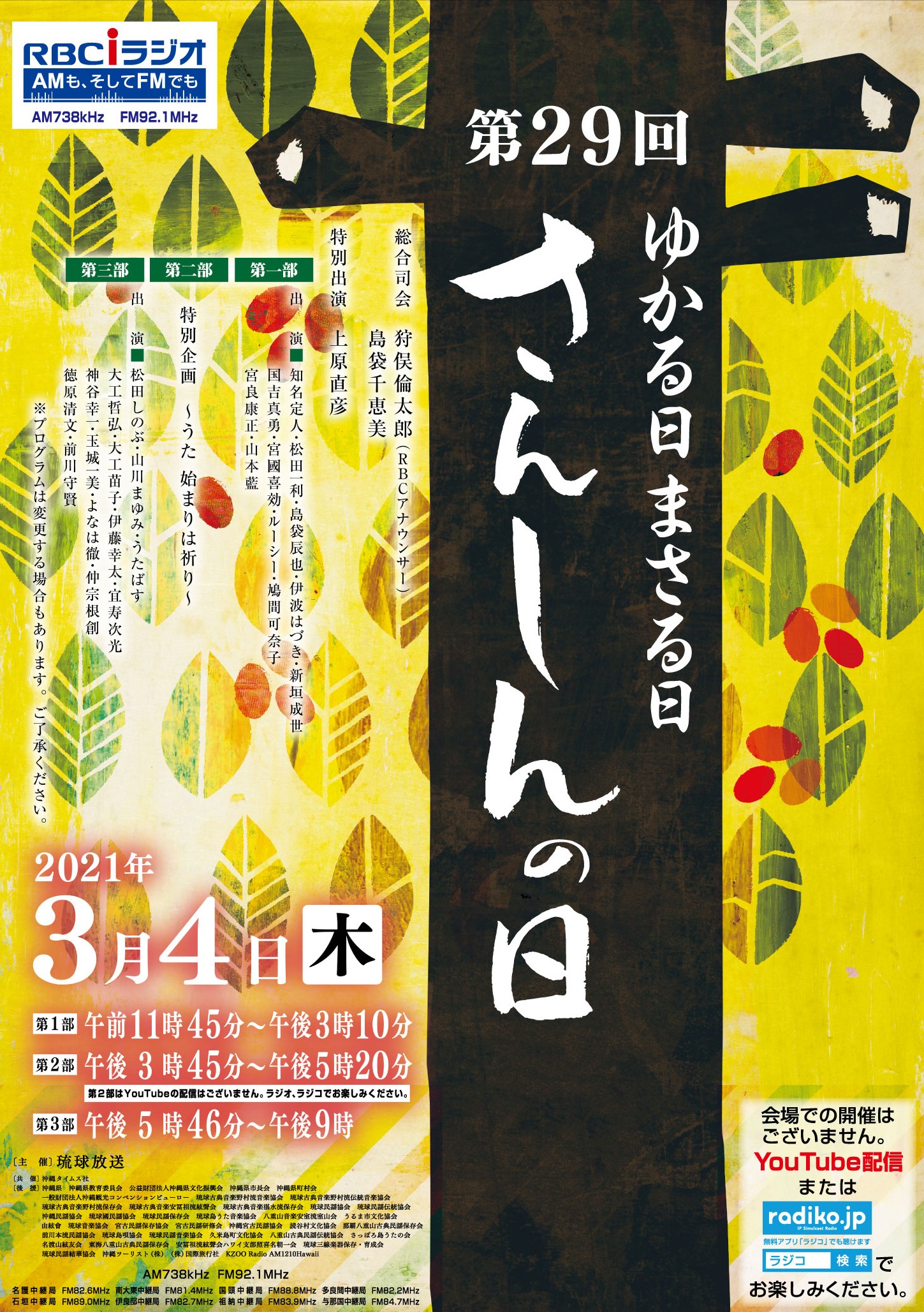 The 29th annual Sanshin no Hi (さんしんの日) is taking place on Thursday, 4th March 2021 (“34 Day” Japan time). There will be 3 parts to the celebration with Part 1 featuring artists as China Sadahito 知名定人 (Sadao’s son), Matsuda Kazutoshi 松田一利, Hatoma Kanako 鳩間可奈子, and Miyara Kōsei 宮良康正 (my relative) among others. Part 2 will be a special performance and Part 3 will feature Yamakawa Mayumi 山川まゆみ, Yonaha Tōru よなは徹, Nakasone Hajime 仲宗根創, and Tokuhara Seibun 徳原清文 among others. Due to the Covid-19 pandemic, the celebration will be broadcast on the radio and will run from 11:45 AM to 9 PM. Hawaii time is March 3rd (Wednesday) from 4:45 PM. It looks like it’ll be streamed on YouTube via RBCi Radio or Music Shower Plus+ account.