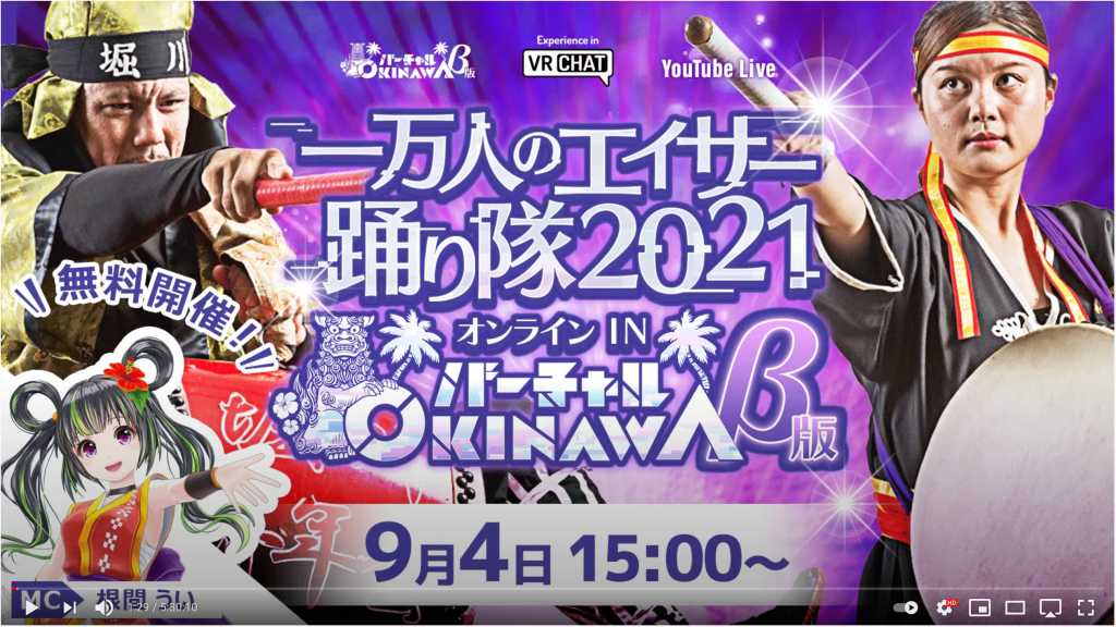 Due to the pandemic, most of this year’s eisaa festivities (there were still smaller, downsized local ones here and there) have been canceled. To make up for it, there was a limited time YouTube VOD of the fantastic film “Eisaa Don Don” (extended to 9/30!), a rebroadcast of the Campus Records x Matsuda Kazutoshi’s 2020 eisaa festival, and now we have Virtual Okinawa’s 10,000 eisaa dancers emceed by our favorite VTuber Nema Ui! While it was live-streamed on 9/4 (Uchinaa time), it’s available as an archive for now. Oh, and it’s around 5 and a half hours long!